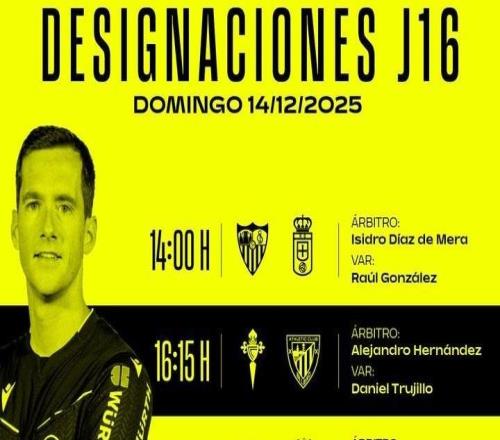 北京时间12月13日,西班牙足协公布了西甲第16轮明日4场比赛的裁判名单,维克托-加西亚执法皇马客战阿拉维斯。塞维利亚vs皇家奥维耶多主裁判:伊西德罗-迪亚斯-德梅拉VAR:劳尔-冈萨